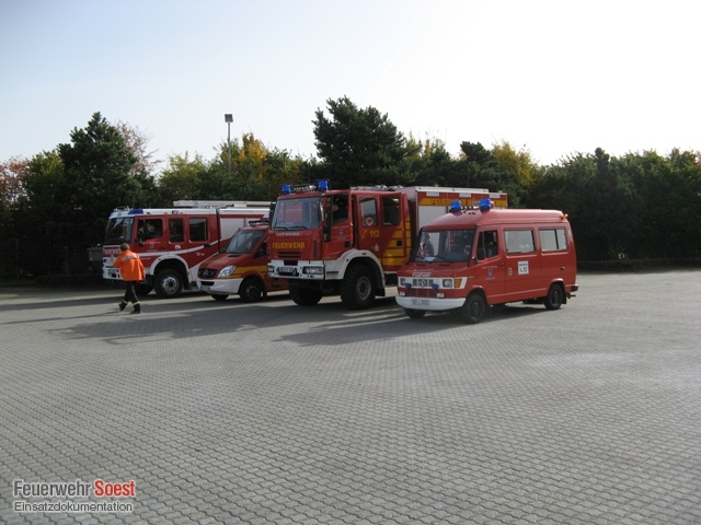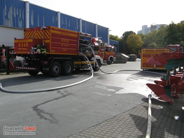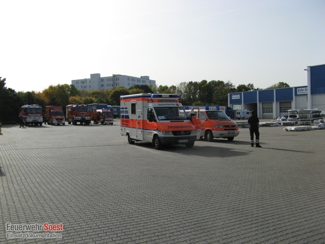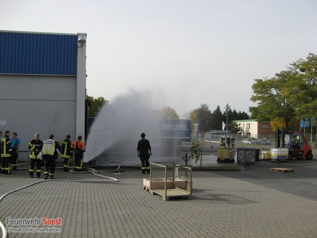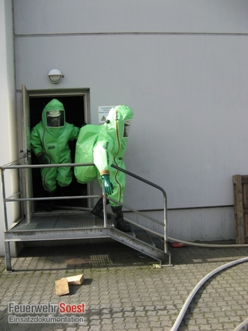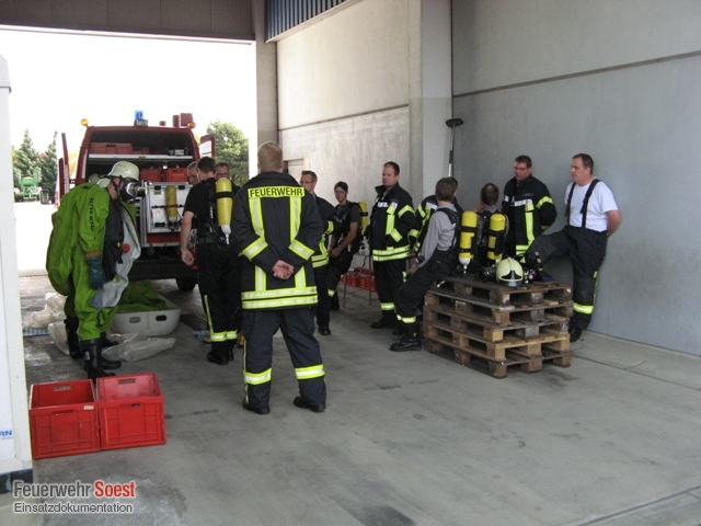 Bei einem Umladevorgang in einer Spedition wurde ein 1.000 l IBC-Behälter mit Eisen-(III)-chlorid durch die Staplergabel beschädigt. Die stark ätzende Flüssigkeit lief in die Lagerhalle und auf den Betriebshof der Firma. Bei dem Versuch das Produkt aufzufangen wurden zwei Arbeiter verletzt und mit Reizungen der Atemwege und der Schleimhäute ins Krankenhaus transportiert. Durch die Feuerwehr erfolgte die Abdichtung aller Regenwassereinläufe auf dem Hof, da diese unmittelbar in die Schledde führen. Danach wurde in Absprache mit der Bezirksregierung (gewerblicher Arbeitsschutz), der unteren Wasserbehörde des Kreises Soest, dem Abwasserwerk und dem Lippeverband die Einleitung in den Schmutzwasserkanal beschlossen. Dazu musste das Produkt zunächt vom Regenwasserkanal in den Schmutzwasserkanal mit einer Gefahrgutpumpe umgepumpt und dann unter starker Verdünnung mit Wasser abgeleitet werden. In der Halle selbst war die ätzende Flüssigkeit teilweise auch unter die Lagerware gelaufen, so dass diese umgesetzt bzw. aus der Halle entfernt werden musste. Alle Arbeiten in direktem Kontakt mit dem Gefahrstoff sind unter Chemikalienschutzanzug durchgeführt worden. Gegen Mittag wurden die Soester Kräfte durch die Feuerwehr Möhnesee abgelöst. Die Reinigungsarbeiten in der Halle und auf dem Betriebsgelände waren gegen 15:30 Uhr beendet. Die kontaminierte Bekleidung und Ausrüstung sowie die Reste des Produkts wurden einem Entsorgungsunternehmen übergeben. Die Feuerwehr war bis gegen 20:00 Uhr mit der Wiederherstellung der Einsatzbereitschaft beschäftigt. Im Einsatz waren insgeamt 68 Einsatzkräfte der Feuerwehr, davon 20 unter Chemikalienschutzanzug.
