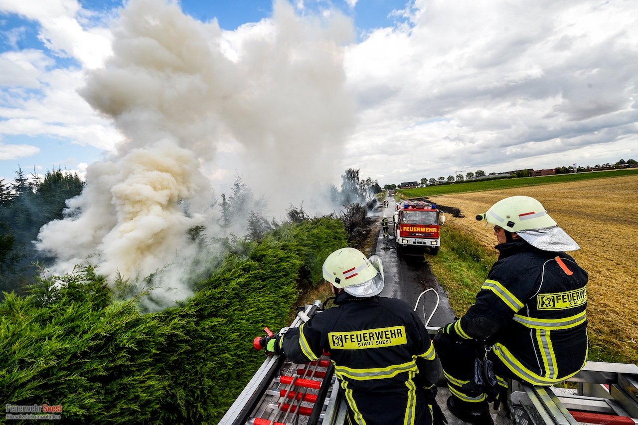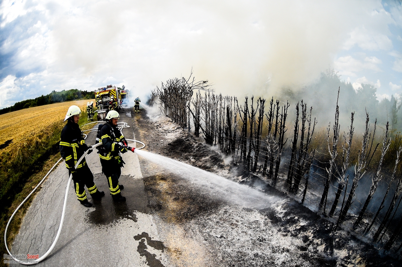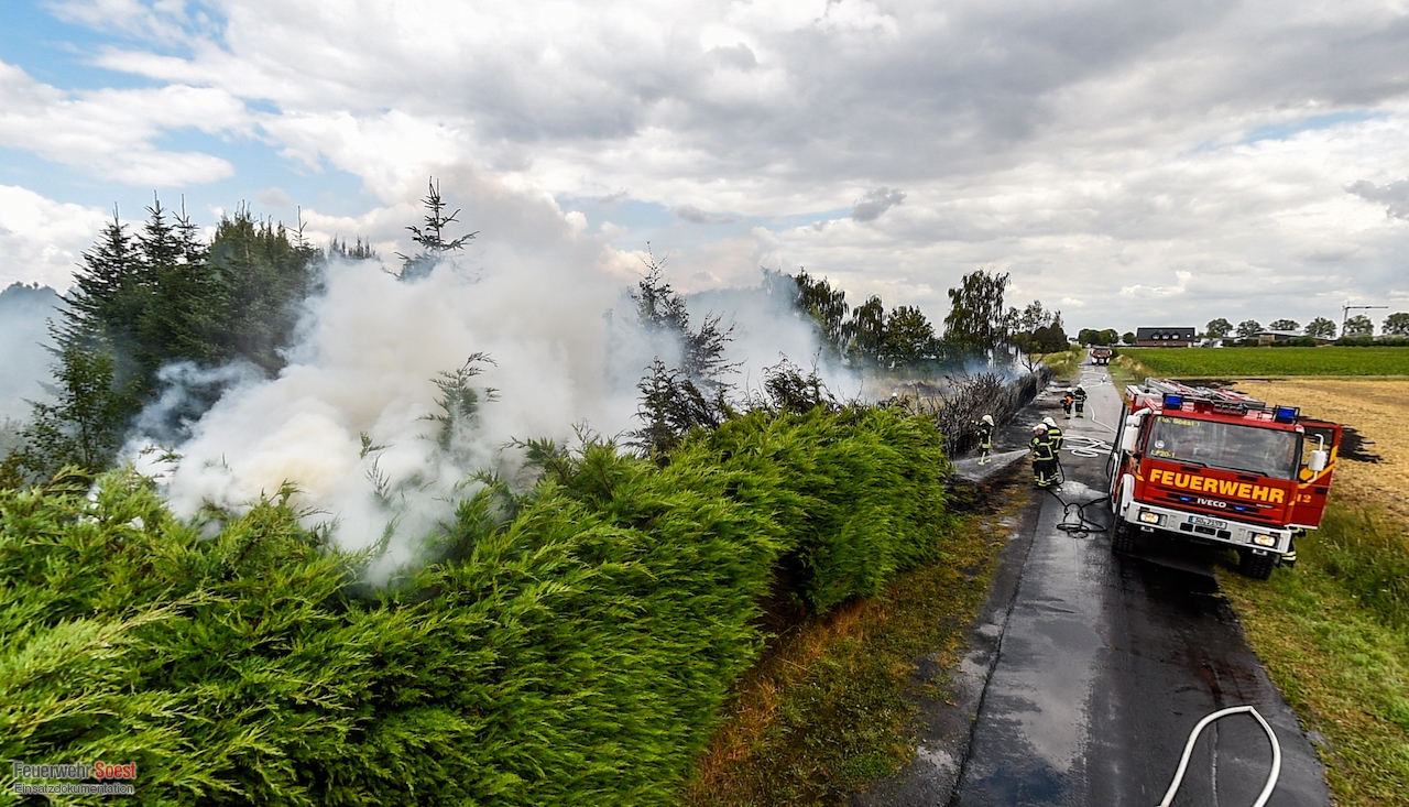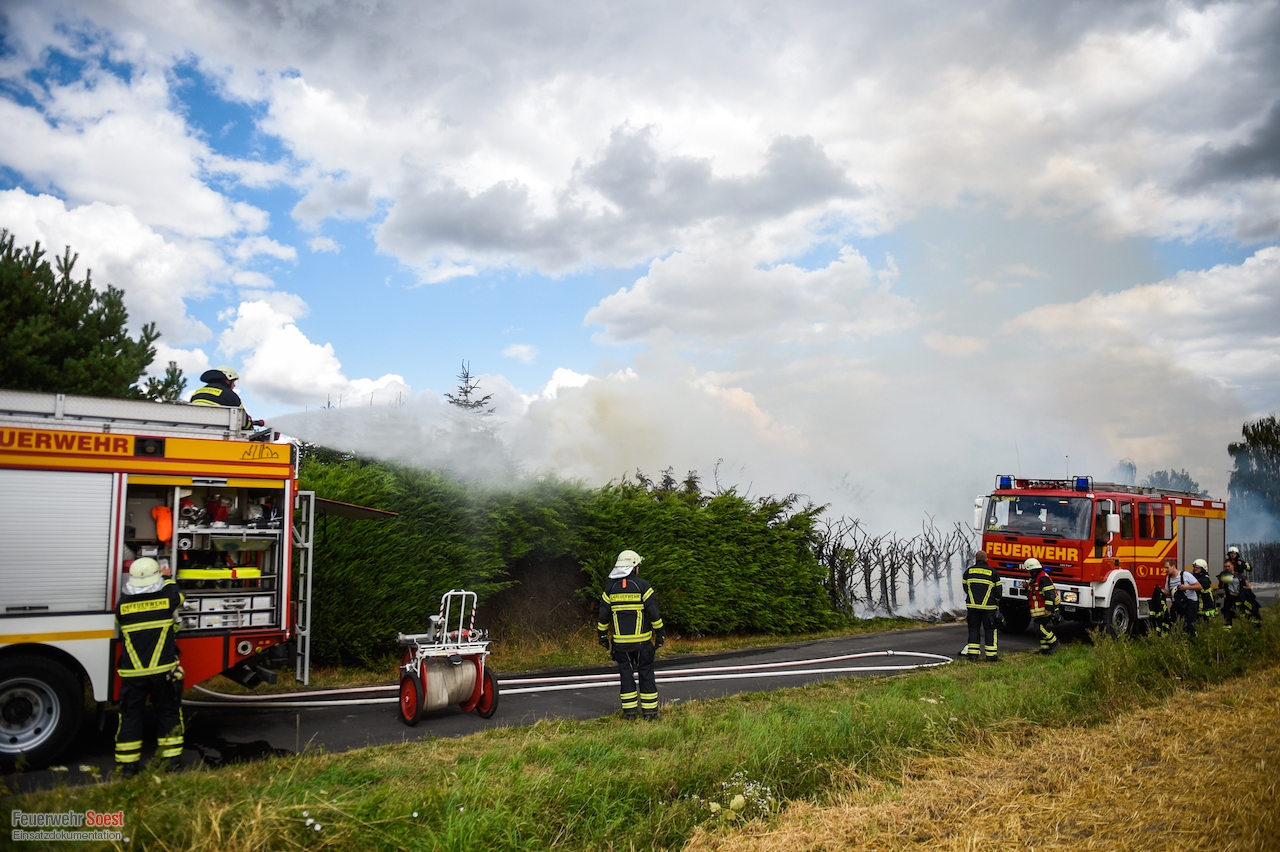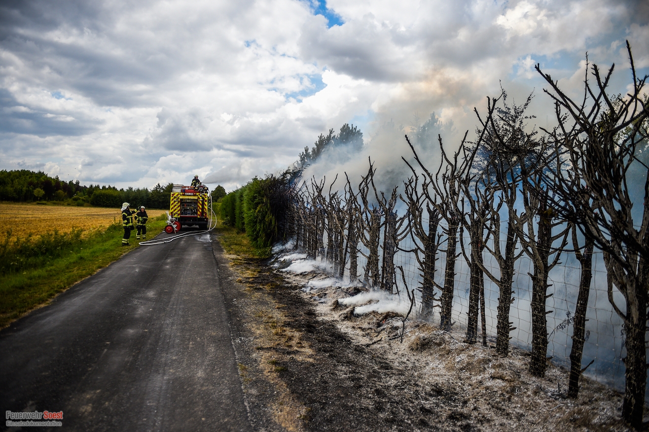 Um 13.05 Uhr wurde die Feuerwehr Soest zum Bergenring im Soester Norden gerufen: An einer Baumschule standen eine Hecke und ein Stoppelfeld in Flammen. "Als wir eintrafen, brannte die Hecke auf einer Länge von etwa 30 Metern", erklärte Einsatzleiter Björn Steinweg. Auf dem Feld loderten nur noch wenige kleine Flammen, eine beachtliche Fläche war jedoch bereits abgebrannt und glimmte nur noch.