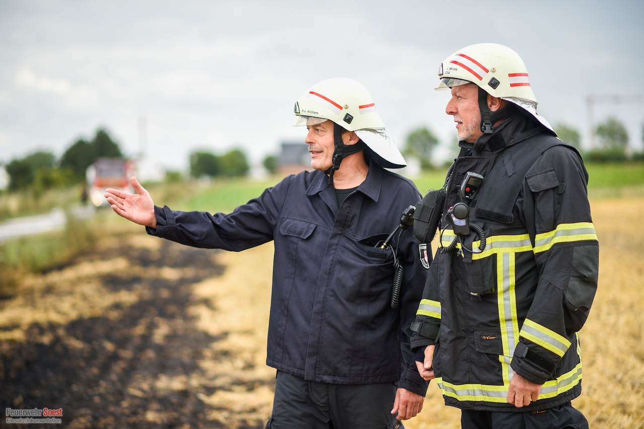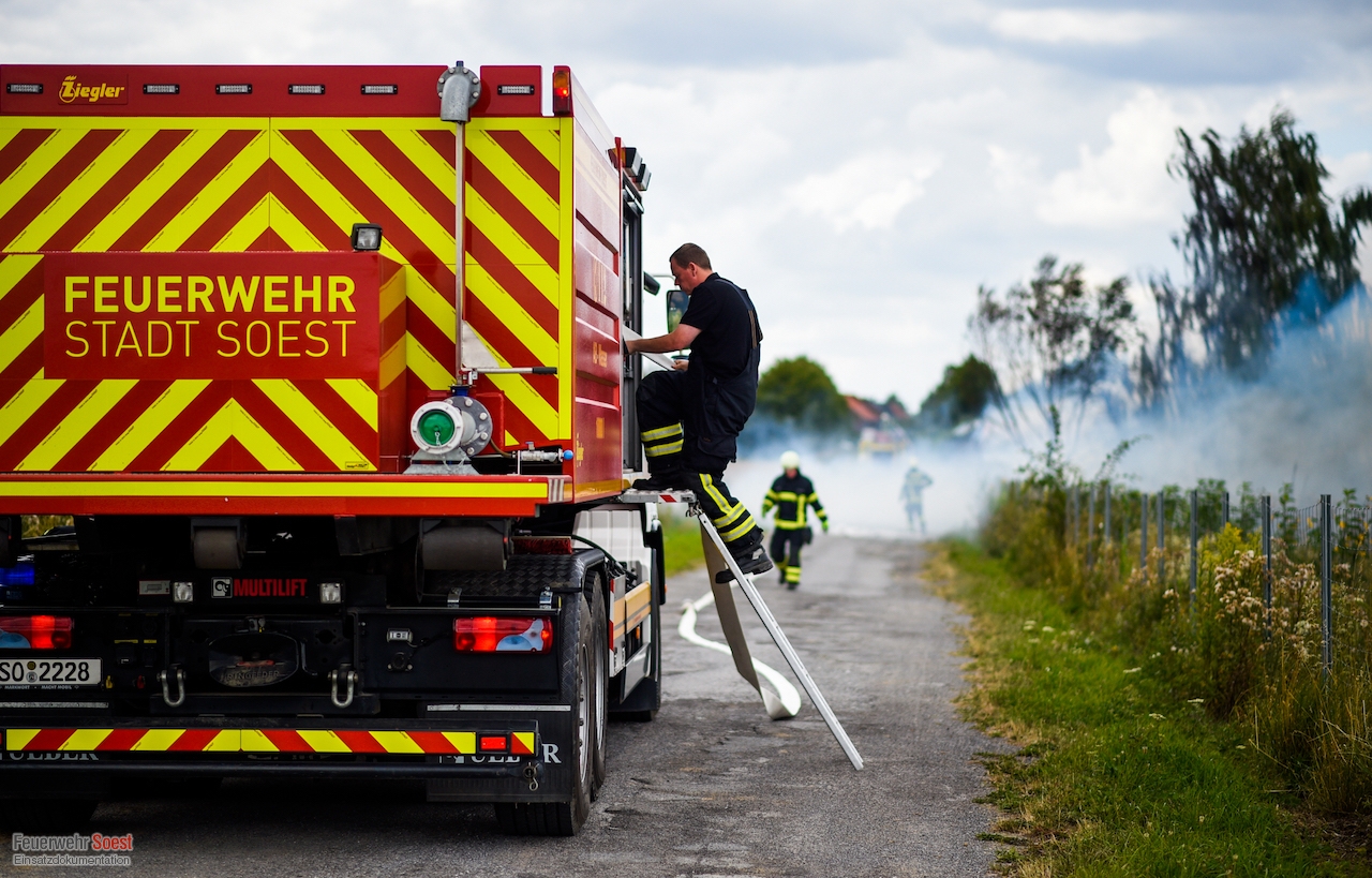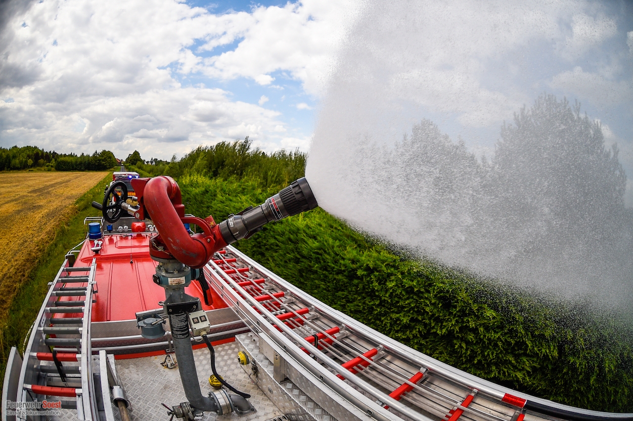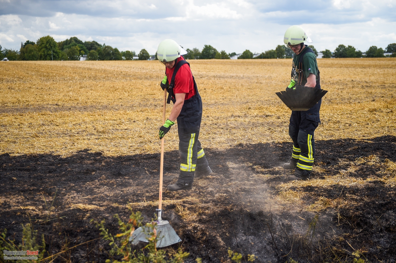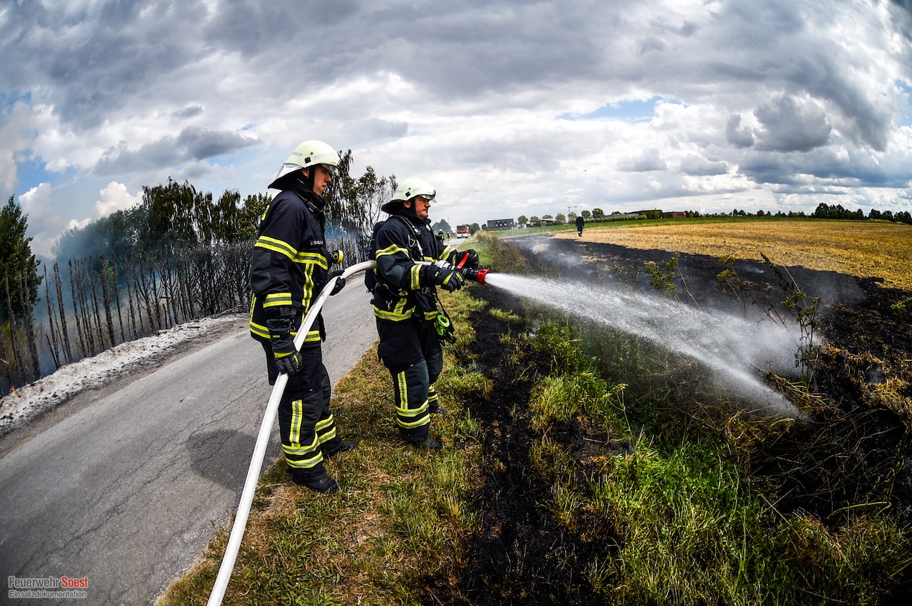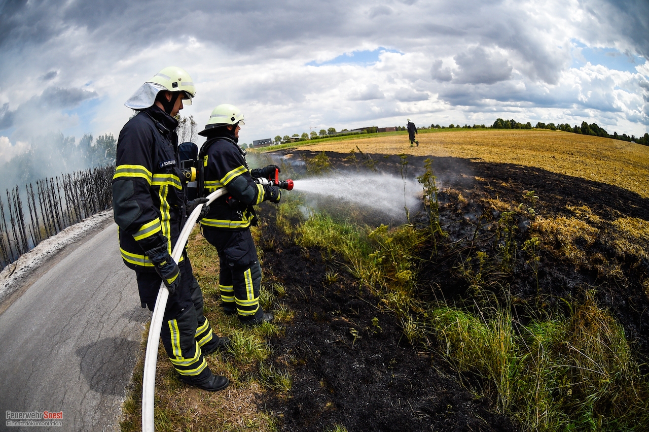 Um 13.05 Uhr wurde die Feuerwehr Soest zum Bergenring im Soester Norden gerufen: An einer Baumschule standen eine Hecke und ein Stoppelfeld in Flammen. "Als wir eintrafen, brannte die Hecke auf einer Länge von etwa 30 Metern", erklärte Einsatzleiter Björn Steinweg. Auf dem Feld loderten nur noch wenige kleine Flammen, eine beachtliche Fläche war jedoch bereits abgebrannt und glimmte nur noch.