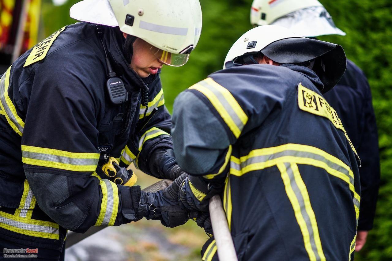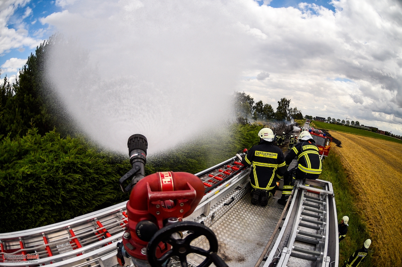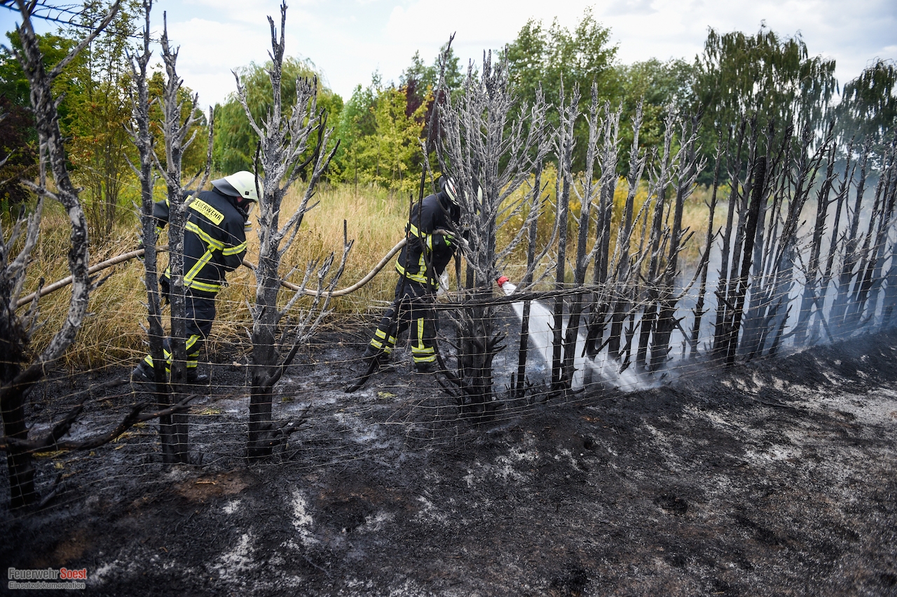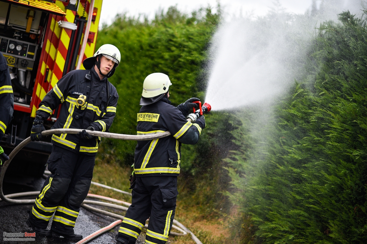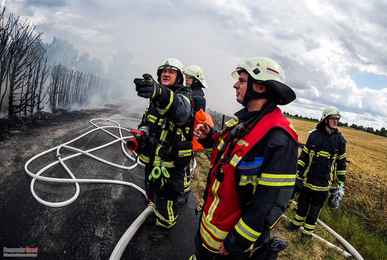 Um 13.05 Uhr wurde die Feuerwehr Soest zum Bergenring im Soester Norden gerufen: An einer Baumschule standen eine Hecke und ein Stoppelfeld in Flammen. "Als wir eintrafen, brannte die Hecke auf einer Länge von etwa 30 Metern", erklärte Einsatzleiter Björn Steinweg. Auf dem Feld loderten nur noch wenige kleine Flammen, eine beachtliche Fläche war jedoch bereits abgebrannt und glimmte nur noch.