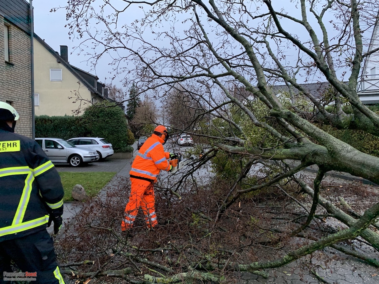 Ein Baum lag quer zur Fahrbahn. Dieser wurde mittels Kettensäge zerkleinert und entfernt.