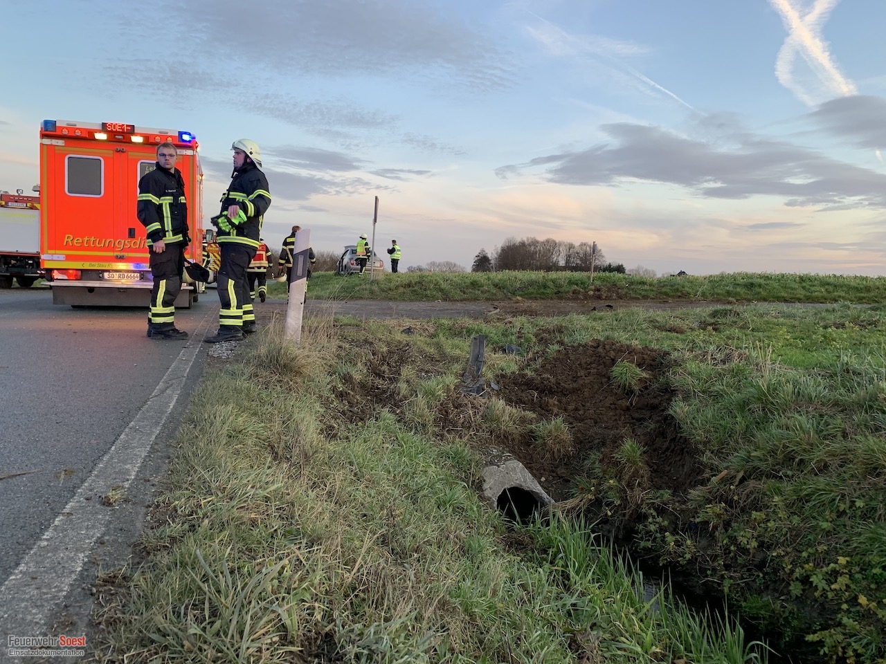 Ein Auto war von der Straße abgekommen und auf einem Feld zum stehen gekommen. Durch den recht starken Aufprall konnte eine Rückenverletzung nicht ausgeschlossen werden. Die Person wurde schonend aus dem Auto befreit und an den Rettungsdienst übergeben.