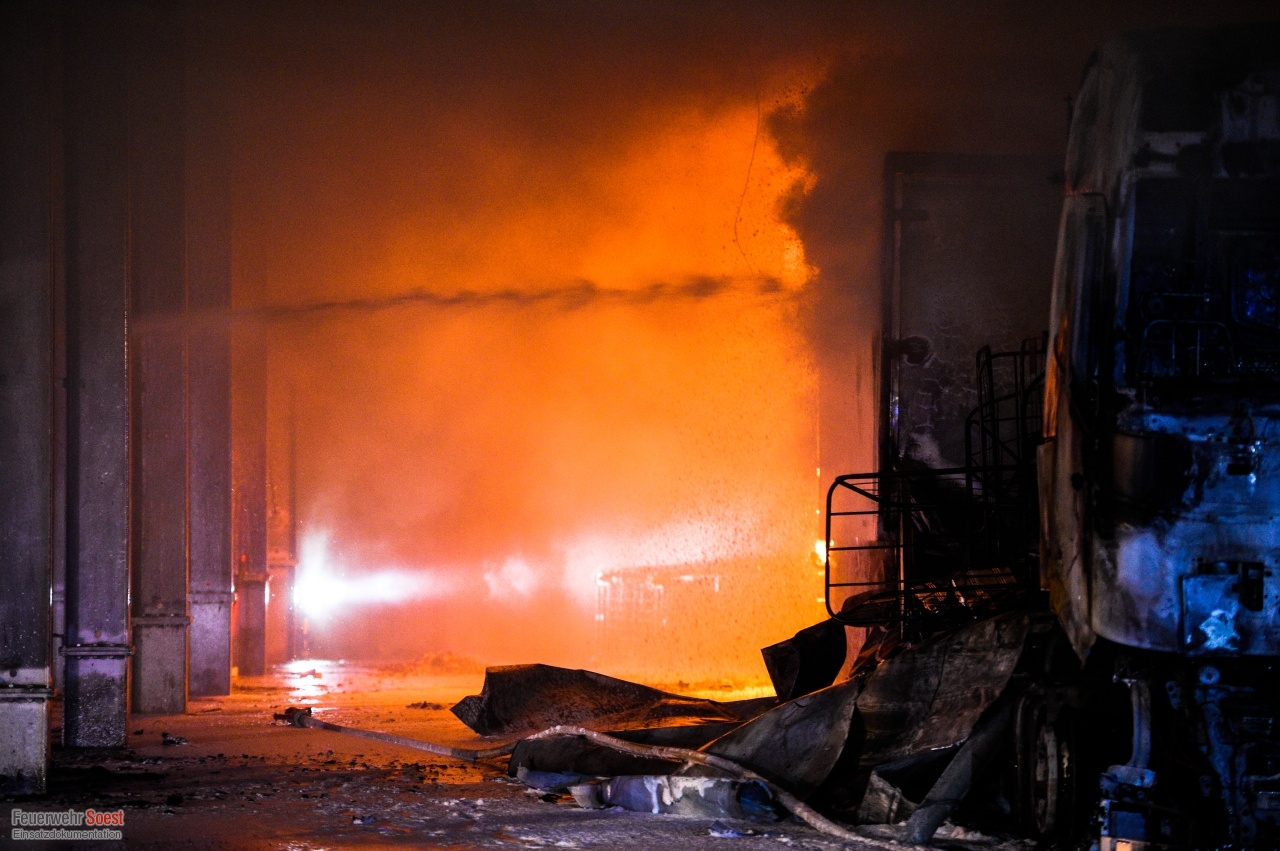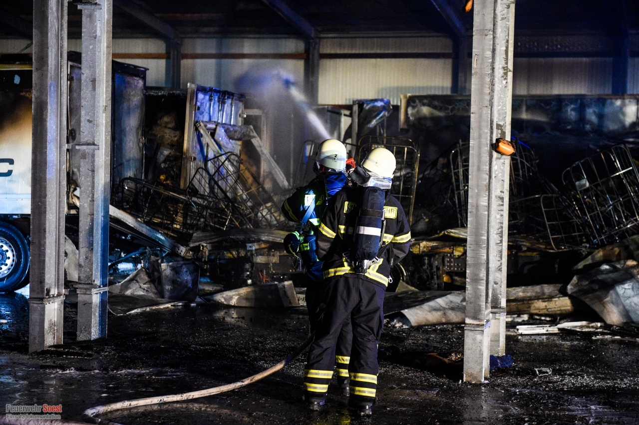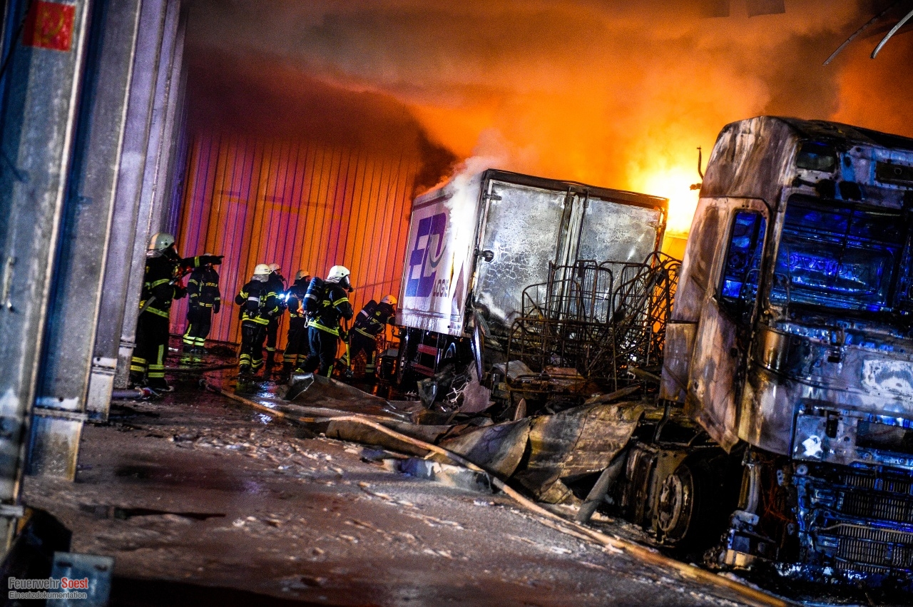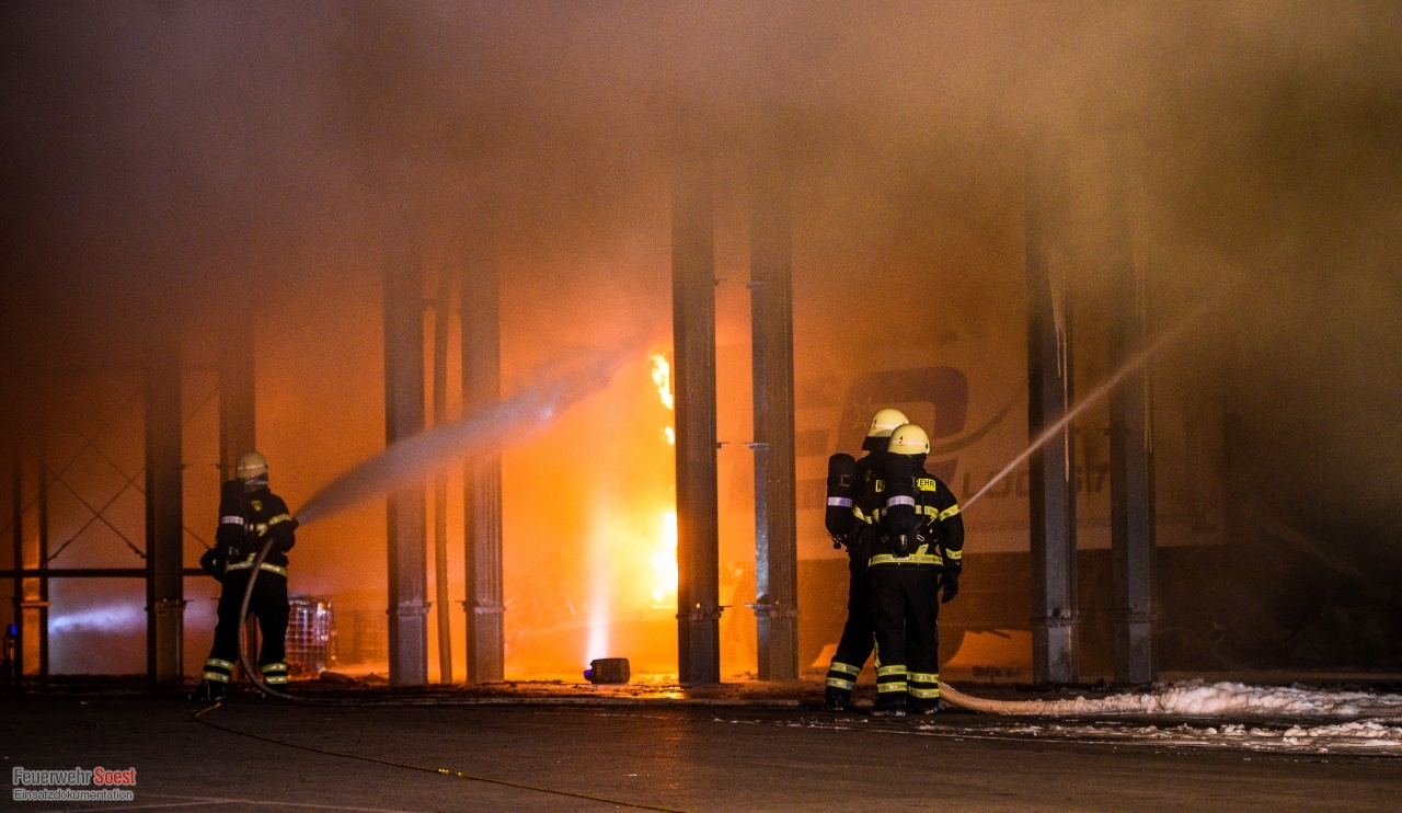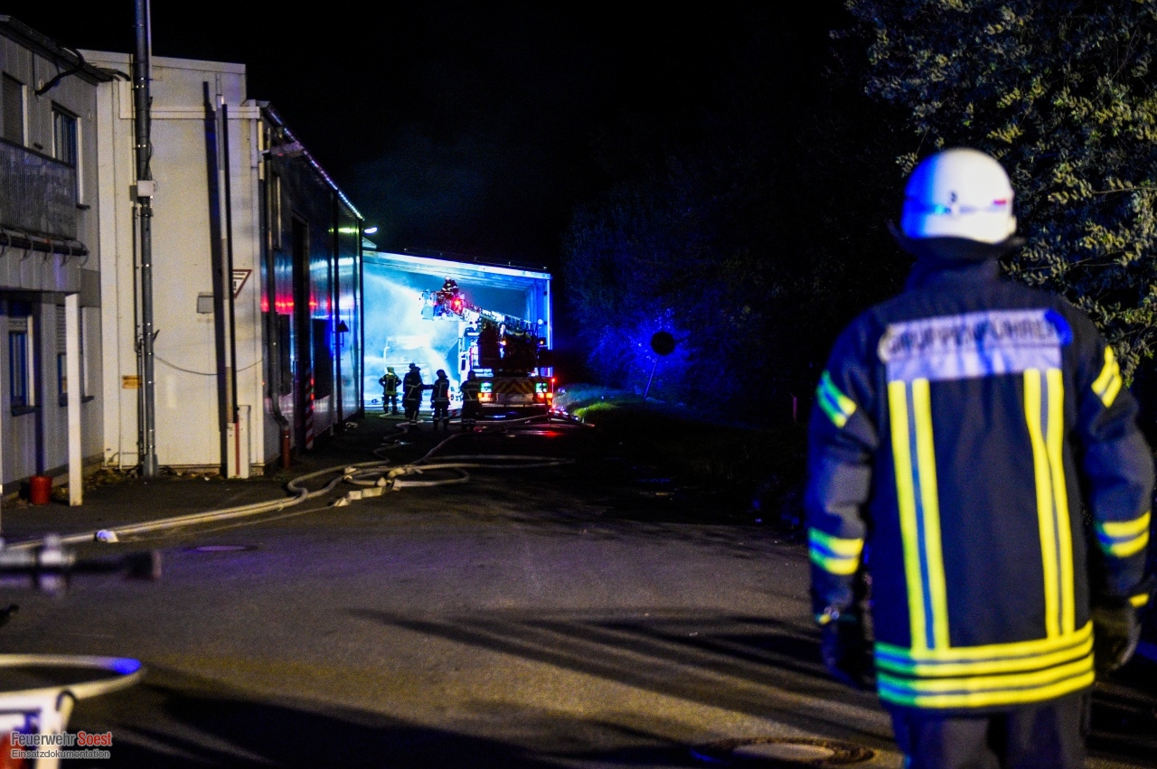 Da das Feuer schnell größer wurde und auch bereits auf die Halle übergriff, wurde Vollalarm für die Feuerwehr Soest gegeben. Dadurch wurden alle sechs Löschzüge alarmiert. Bedingt durch den Vollalarm wurden auch mehrere überörtliche Einheiten mitalarmiert.