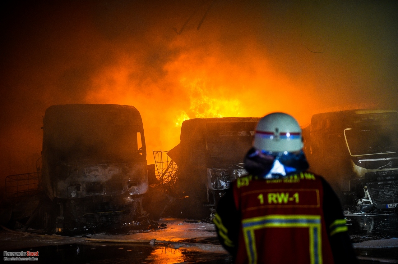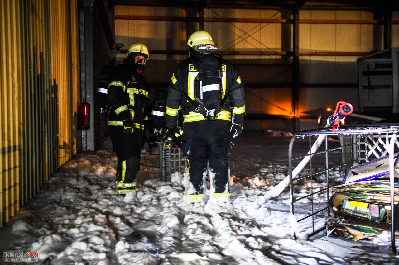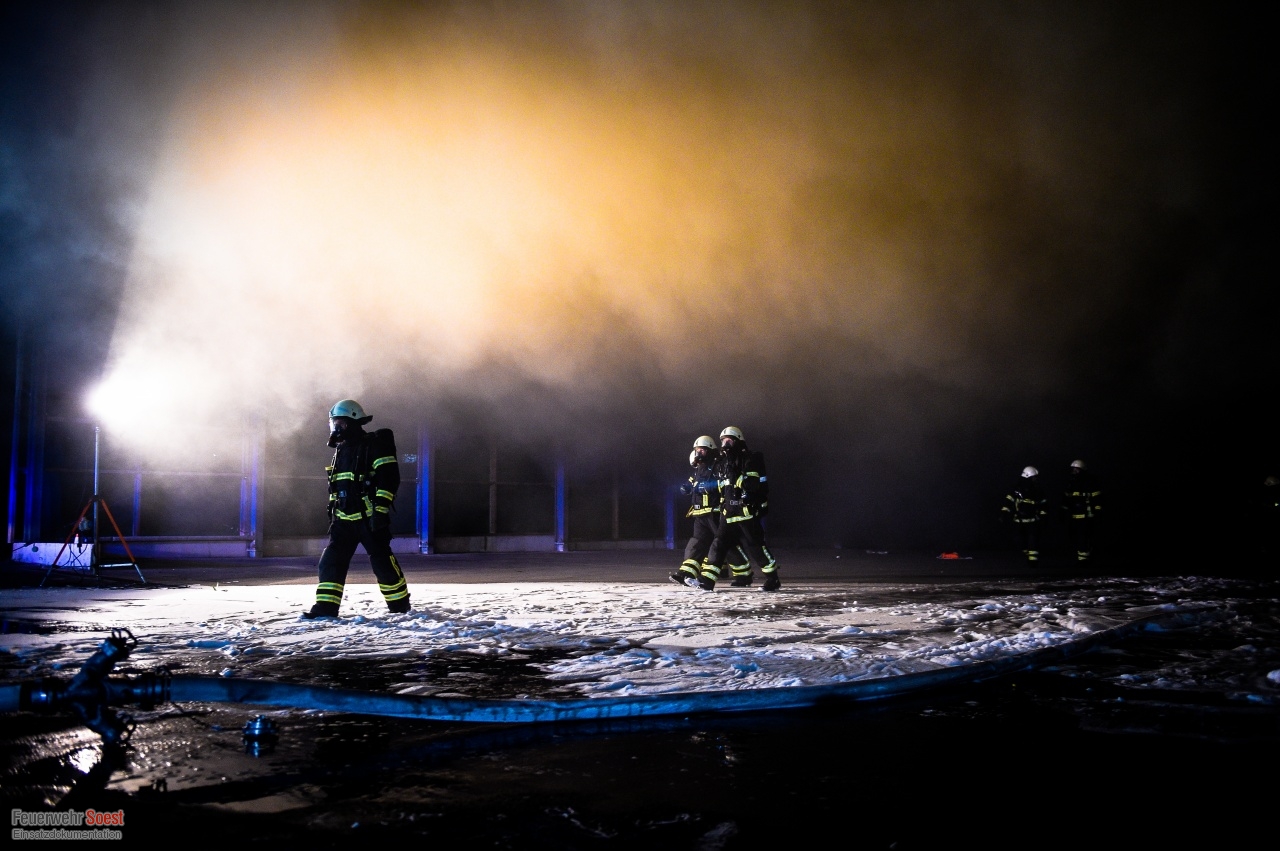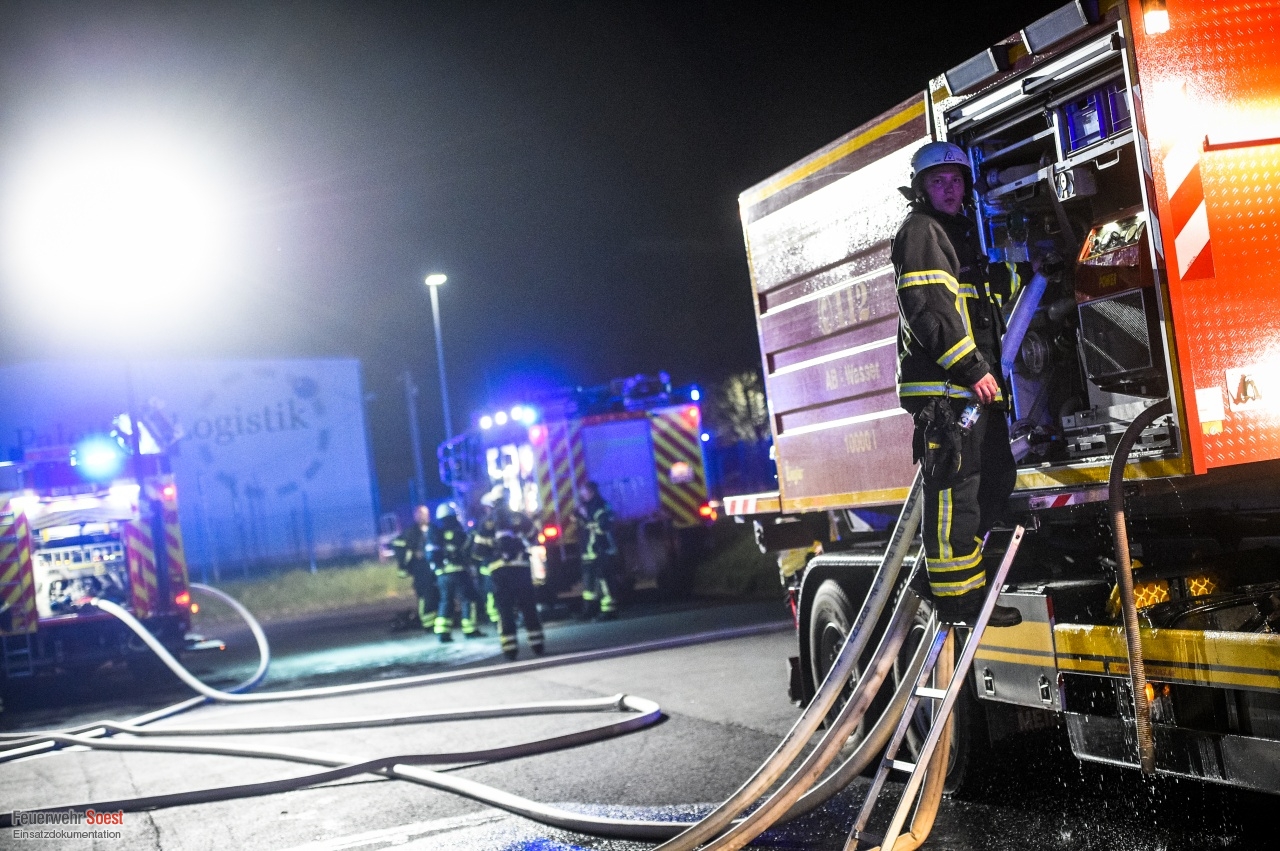 Da das Feuer schnell größer wurde und auch bereits auf die Halle übergriff, wurde Vollalarm für die Feuerwehr Soest gegeben. Dadurch wurden alle sechs Löschzüge alarmiert. Bedingt durch den Vollalarm wurden auch mehrere überörtliche Einheiten mitalarmiert.