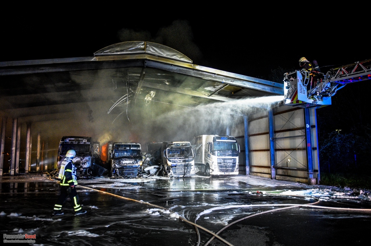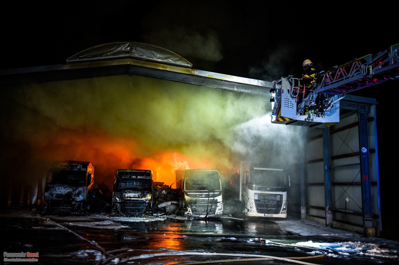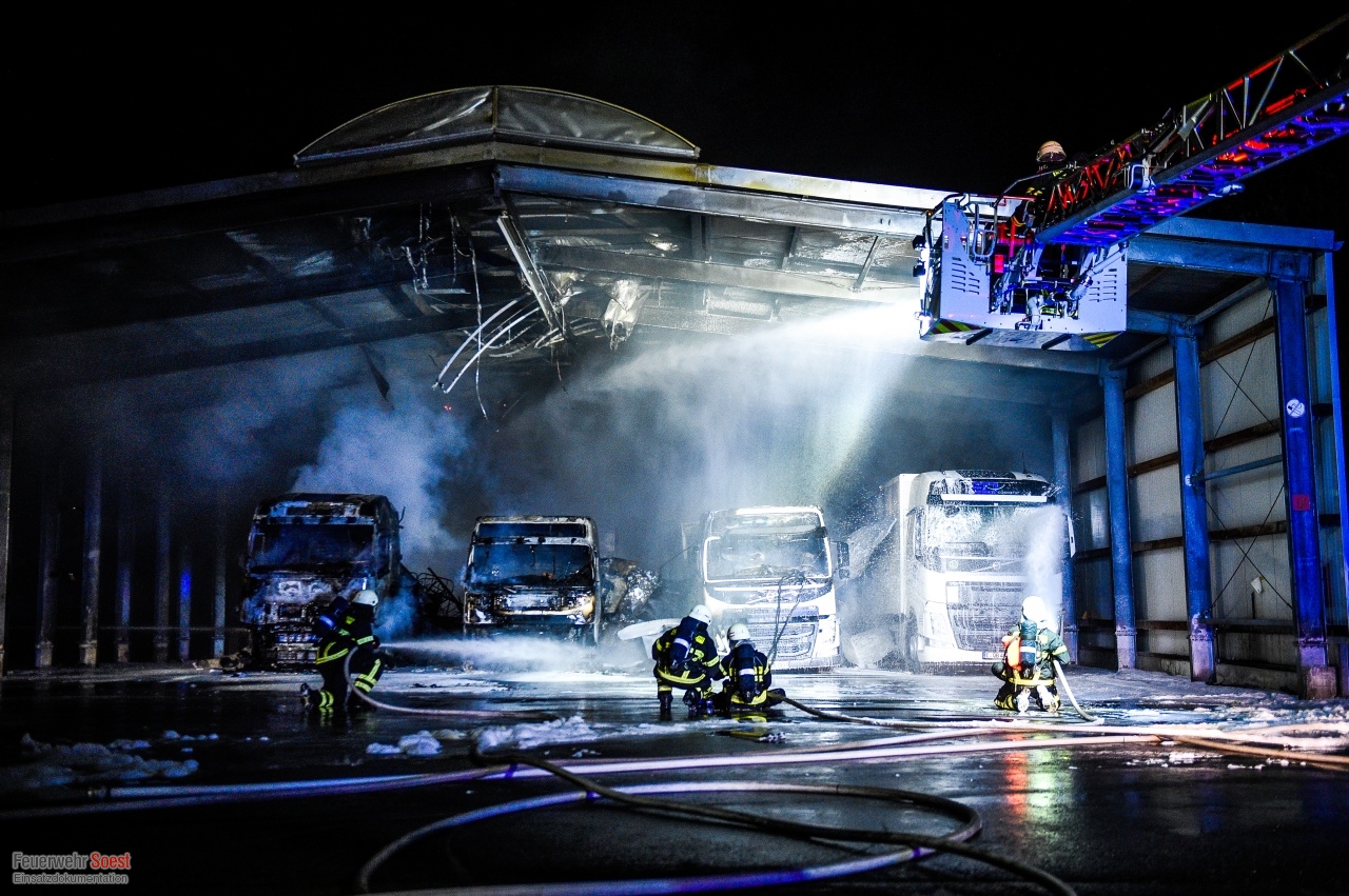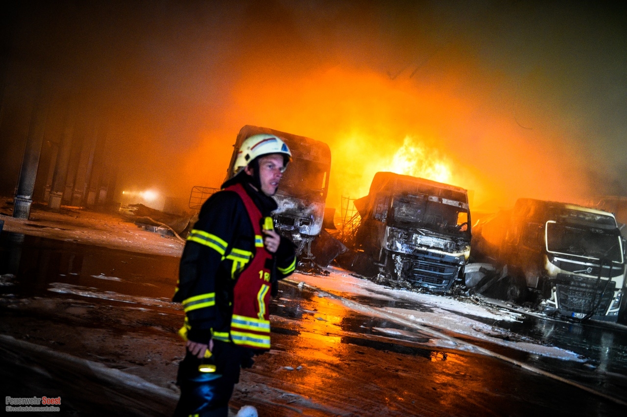 Da das Feuer schnell größer wurde und auch bereits auf die Halle übergriff, wurde Vollalarm für die Feuerwehr Soest gegeben. Dadurch wurden alle sechs Löschzüge alarmiert. Bedingt durch den Vollalarm wurden auch mehrere überörtliche Einheiten mitalarmiert.