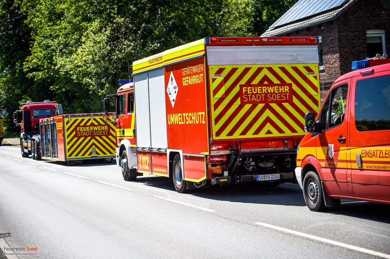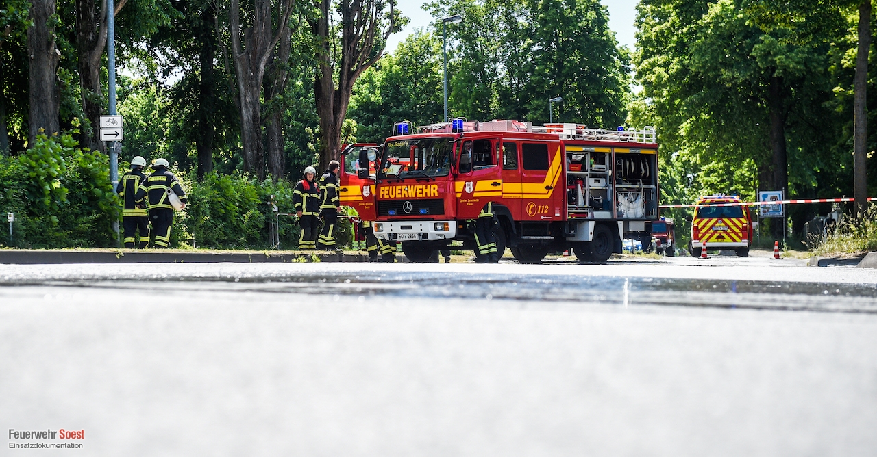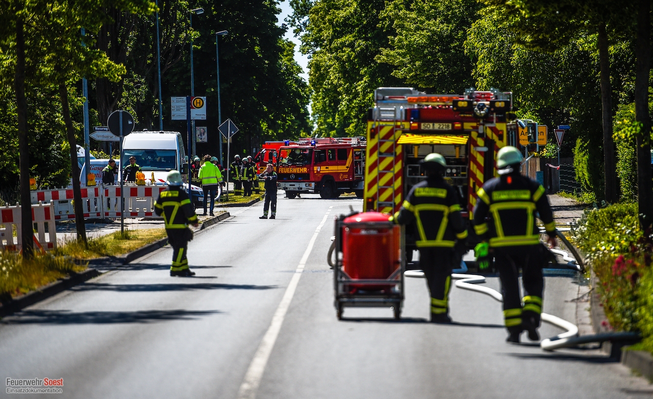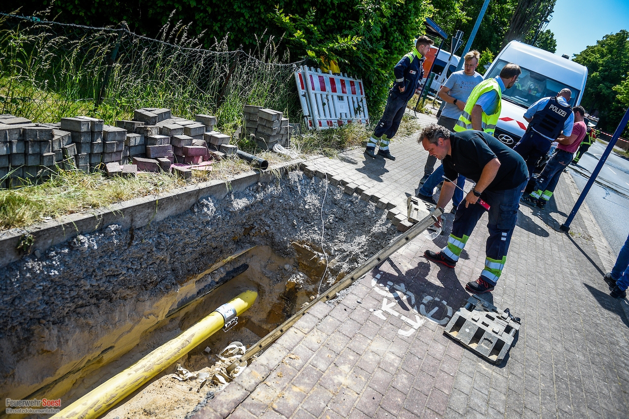 Um 14:35 Uhr wurden die beiden Löschzüge der Innenstadt, sowie der Löschzug 3, 5 und 6 zur Werler Landstraße in Ampen alarmiert. Bei Bauarbeiten wurde hier eine Hochdruckgasleitung beschädigt. Umgehend wurde Einsatzstelle weiträumig abgesperrt und der Brandschutz sichergestellt. Die Bewohner eines angrenzenden Wohnhauses wurden durch die Feuerwehr aus den Gefahrenbereich verbracht. Anschließend begannen die Stadtwerke Soest damit den Druck der Gasleitung zu reduzieren. Im Anschluss war es ihnen möglich, eine Manschette anzubringen und so die Leckage abzudichten.