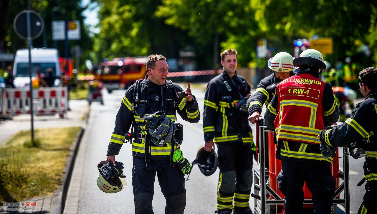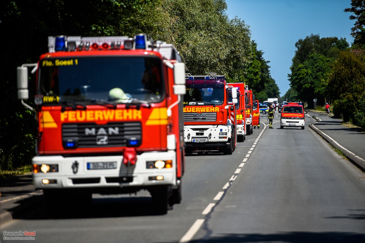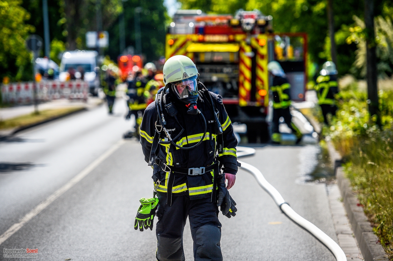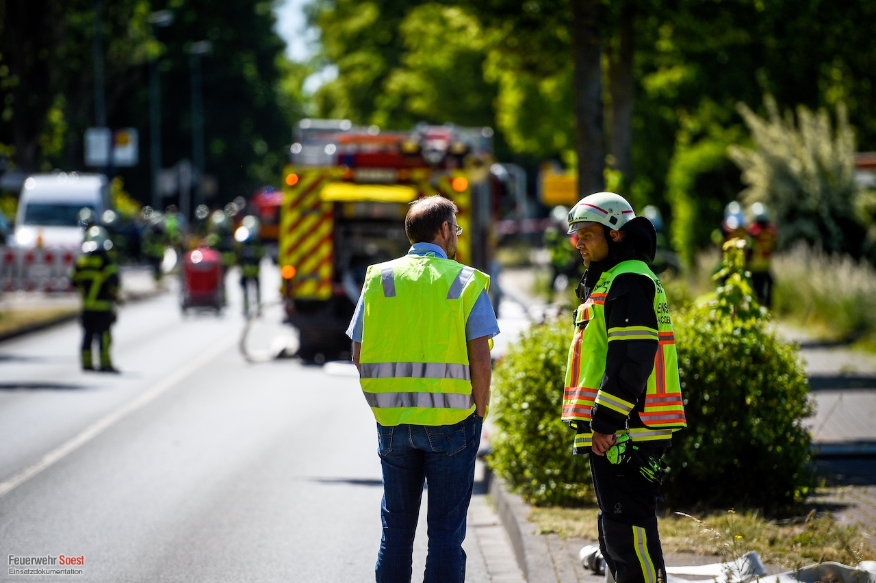 Um 14:35 Uhr wurden die beiden Löschzüge der Innenstadt, sowie der Löschzug 3, 5 und 6 zur Werler Landstraße in Ampen alarmiert. Bei Bauarbeiten wurde hier eine Hochdruckgasleitung beschädigt. Umgehend wurde Einsatzstelle weiträumig abgesperrt und der Brandschutz sichergestellt. Die Bewohner eines angrenzenden Wohnhauses wurden durch die Feuerwehr aus den Gefahrenbereich verbracht. Anschließend begannen die Stadtwerke Soest damit den Druck der Gasleitung zu reduzieren. Im Anschluss war es ihnen möglich, eine Manschette anzubringen und so die Leckage abzudichten.