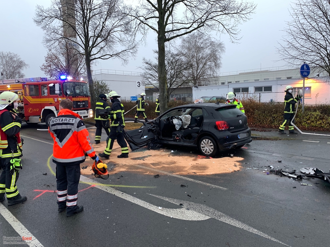 Hier kam es zu einer Kollision zweier Pkw. Zur schonenden Rettung wurde eine Person mittels technischem Gerät aus ihrem Fahrzeug befreit und an den Rettungsdienst übergeben. Zur weiteren Untersuchung wurde sie einem umliegenden Krankenhaus