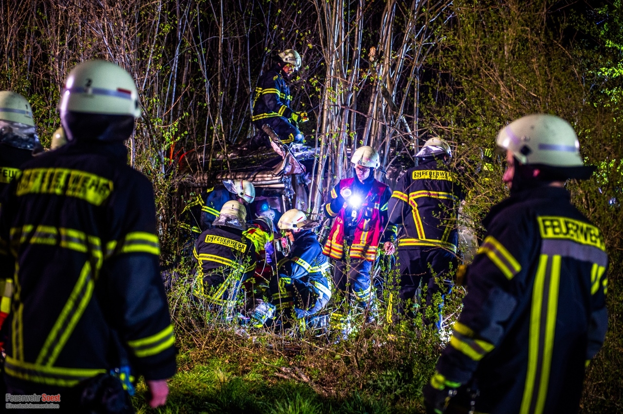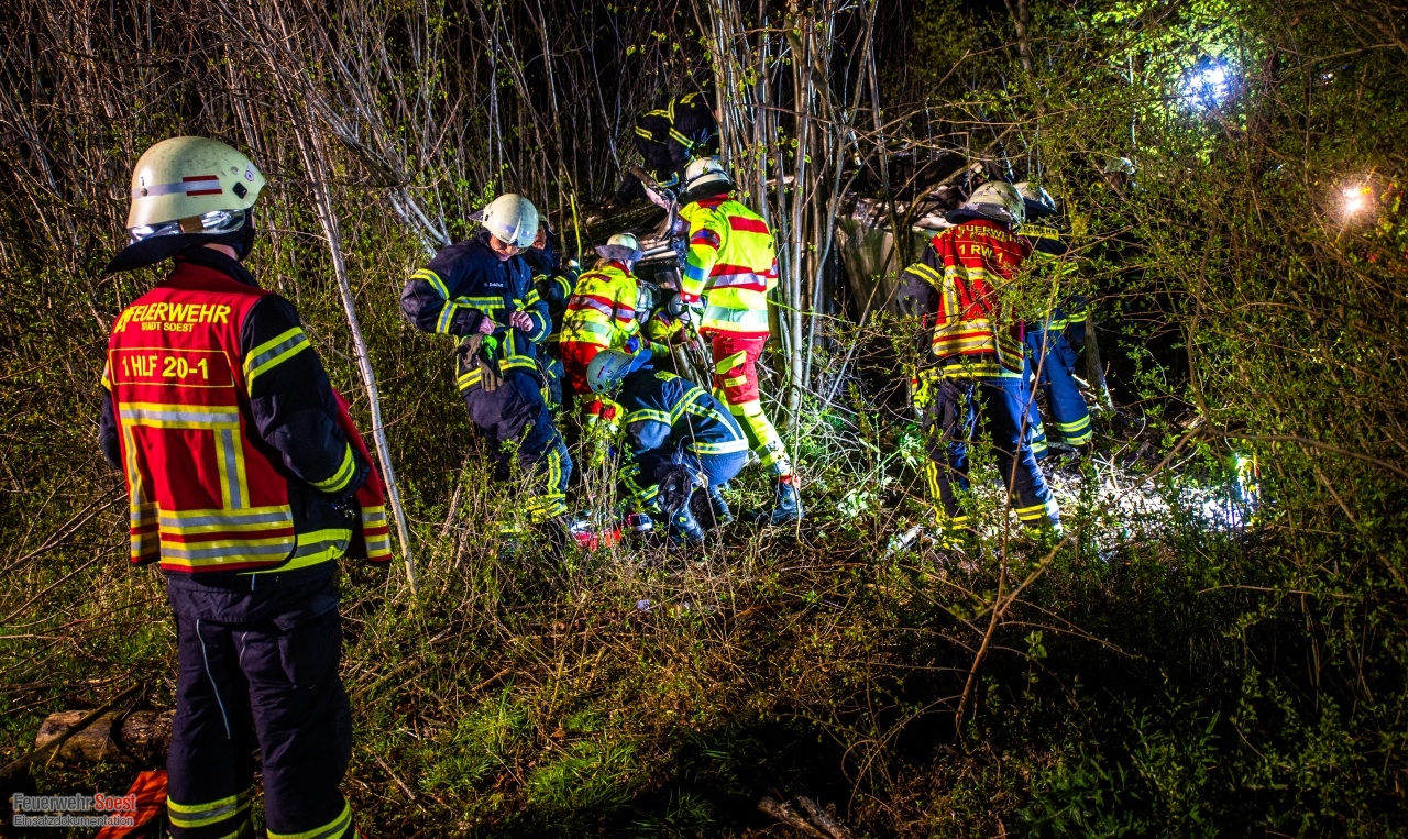 Ein Pkw war in der Auf- und Abfahrt der A44 von der Fahrbahn abgekommen und auf der Seite liegend im Gebüsch zum stehen gekommen. Durch die Kollision mit mehreren Bäumen wurde das Fahrzeug stark deformiert und der Fahrer in seinem Fahrzeug eingeklemmt. Wir sicherten das Fahrzeug mit einer Seilwinde gegen ein unkontrolliertes umkippen. Anschließend wurde der Fahrer medizinisch versorgt und danach über das Dach aus seinem Fahrzeug befreit.