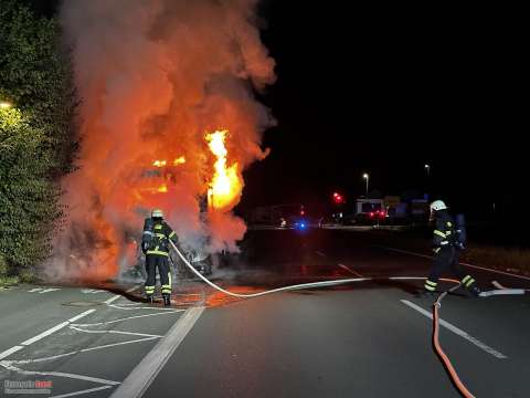 Beim Eintreffen der ersten Kräfte stand die Zugmaschine bereits im Vollbrand. Unverzüglich wurde die Brandbekämpfung mit zwei Strahlrohren und einem Trupp unter schwerem Atemschutz eingeleitet. Dies zeigte auch sehr schnell Wirkung und das Feuer war schnell gelöscht.